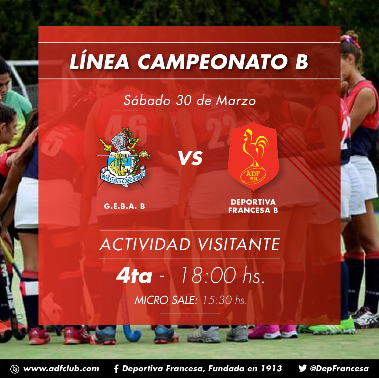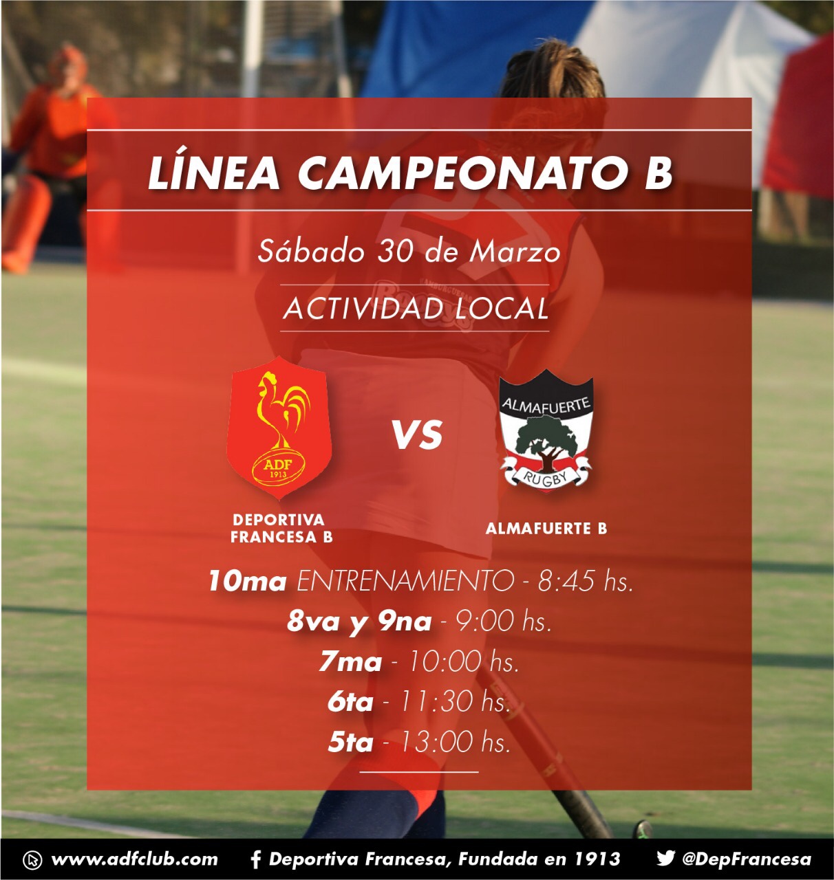 Línea Campeonato B – Sábado 30/3Por Deportiva Francesa / 29 marzo, 2019 Segunda fecha para la B que recibe a Almafuerte en Del Viso. 4ta visita a GEBA. #EstoEsFrancia