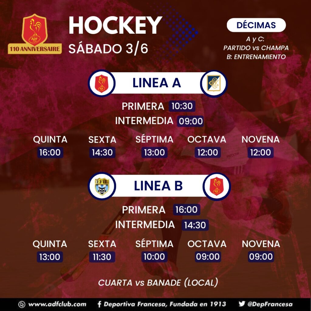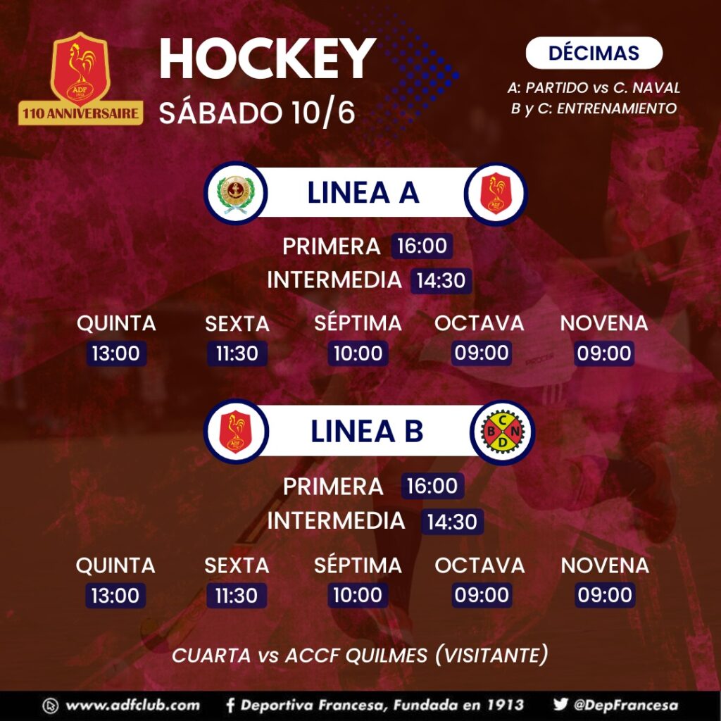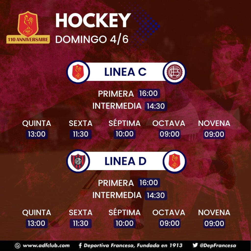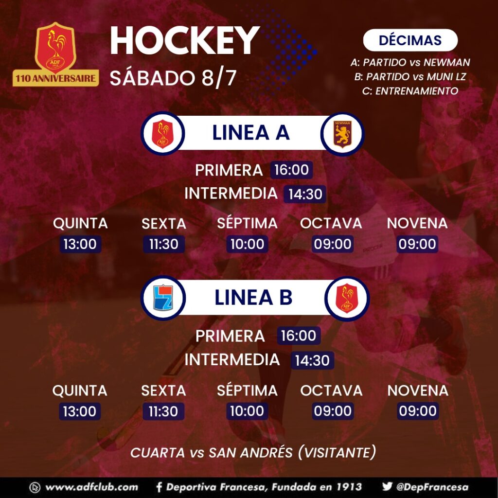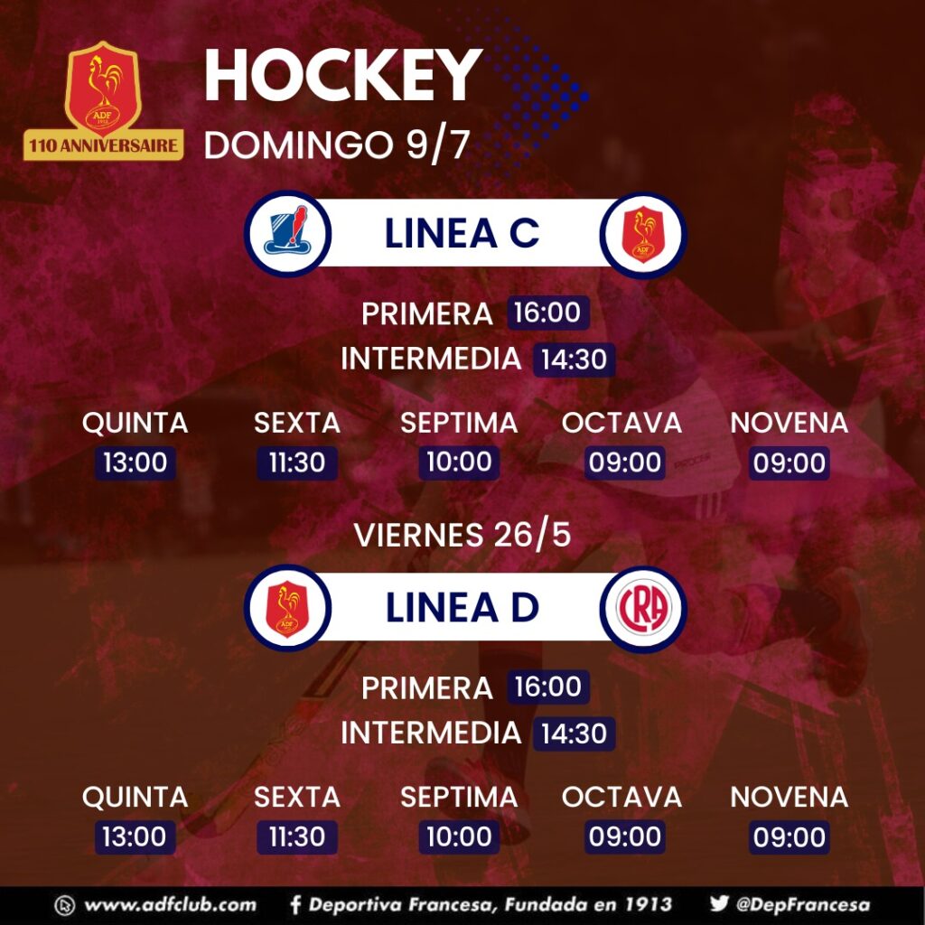 Décima, Hockey, Novena, Octava, Plantel Superior, Quinta, Séptima, SextaHorarios Hockey domingo 9/7/23 Deportiva Francesa / 7 julio, 2023